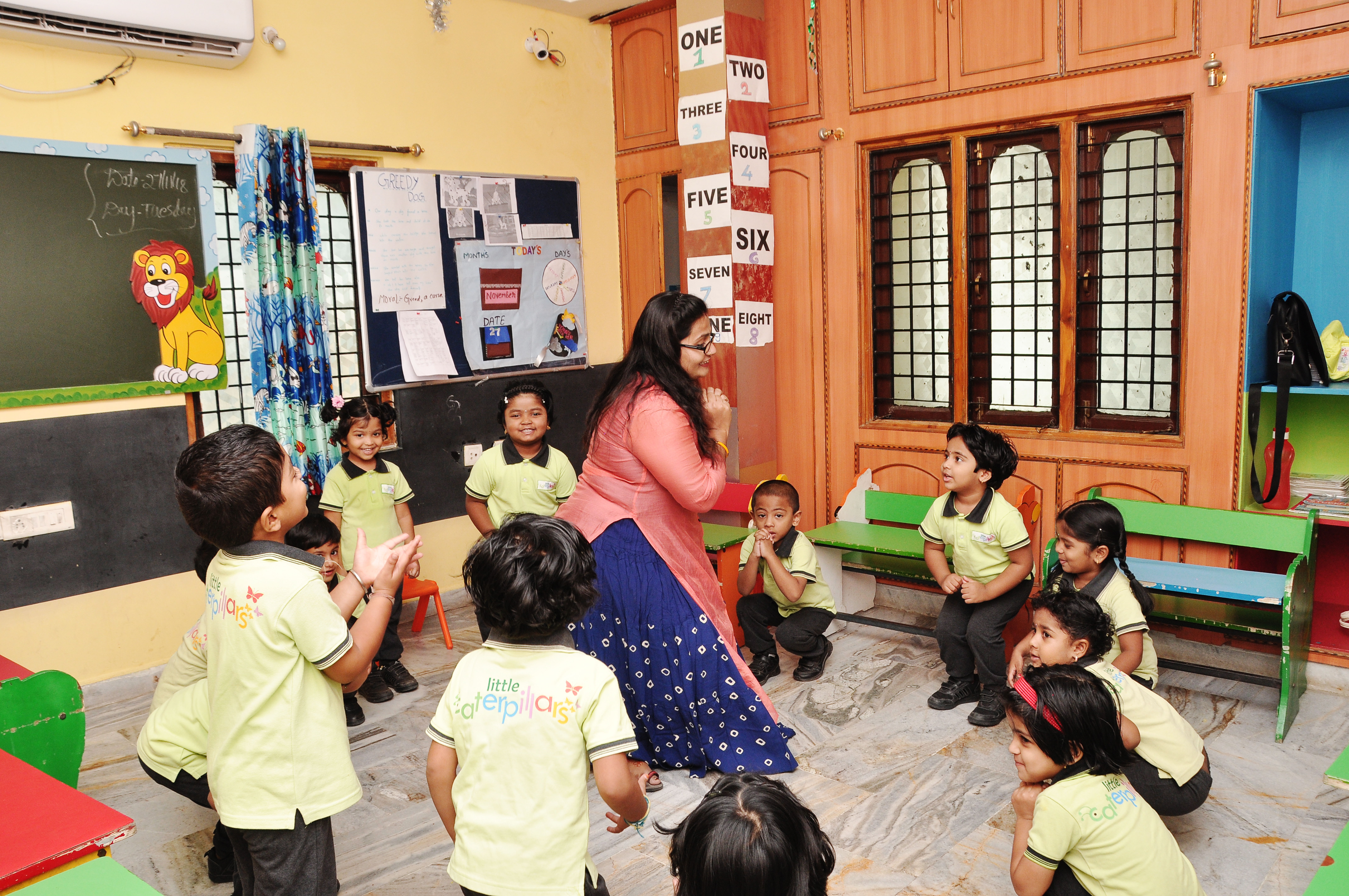 Senior KG students further their literacy and numeracy skills with complex activities. They engage in advanced phonics, word formation, and number operations, including basic math concepts. Hindi education progresses, enhancing their ability to communicate and understand a second language. Telugu is also introduced. Our enriched curriculum also includes a wider array of extracurricular activities such as advanced dance routines, karate, sports, and competitions. These activities are designed to refine their motor skills, boost self-confidence, and improve teamwork abilities.